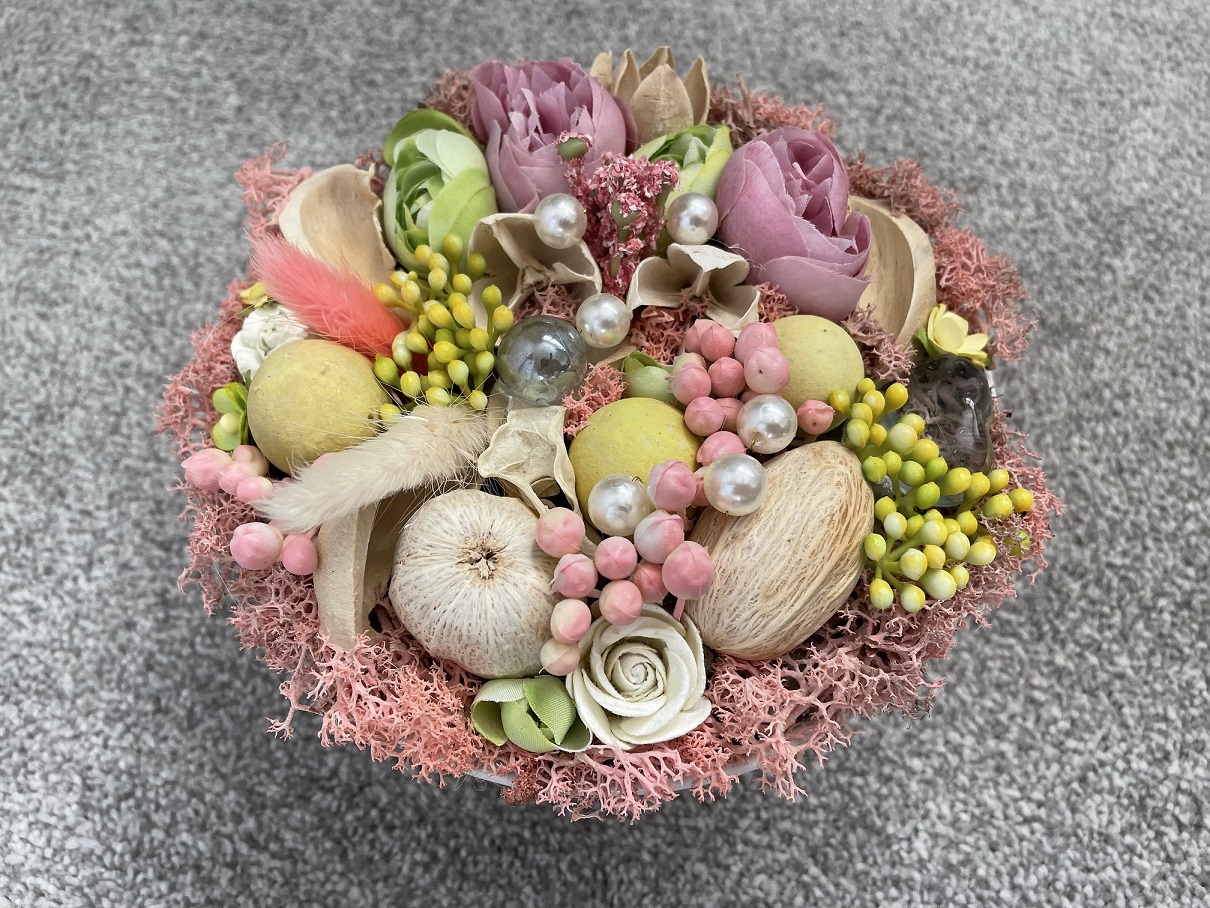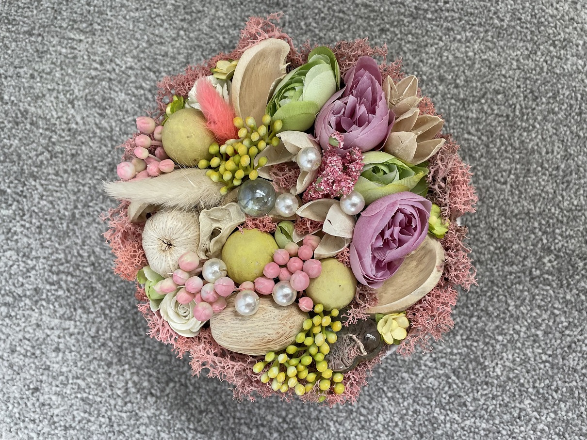 Made from natural dried pods and artificial flowers.