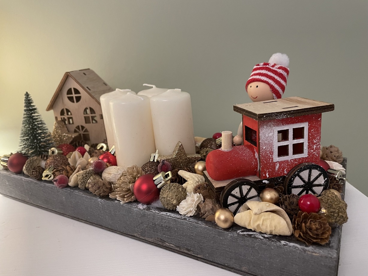 Made from natural pods, soft toys and decorated with Christmas style crafts.